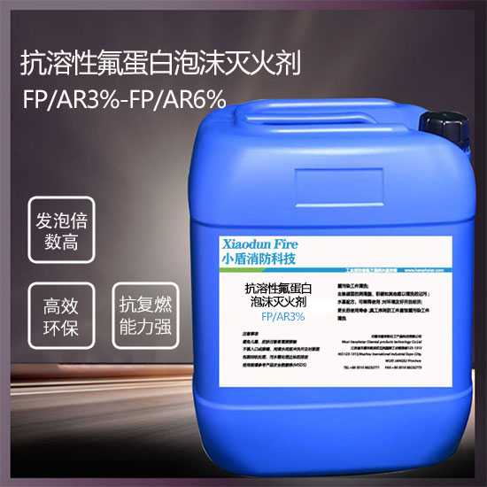抗溶性氟蛋白滅火劑由氨基酸型氟表面活性劑、耐液性添加劑、氟碳表面活性劑、水解蛋白、膠化防止劑等原料配制而成,除具有氟蛋白的特點(diǎn)外,還可在醇類等水溶性物質(zhì)表面形成一層聚合物膠膜,靠泡沫和膠膜的雙重作用,迅速而有效地隔絕空氣,將火窒息。主要用于撲救醇、醚、醛、酮等水溶性物質(zhì)的火災(zāi);也可撲救石油及石油產(chǎn)品等非水溶性物質(zhì)的火災(zāi)。廣泛用于大型化工企業(yè)、油田、油庫(kù)、機(jī)庫(kù)等固定滅火裝置,也可用于消防車等移動(dòng)滅火設(shè)備。按與水的體積混合比為3∶97(3%FP/AR)、保質(zhì)期2年。